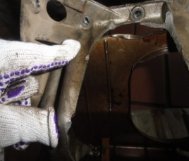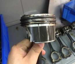 (2)除第一缸活塞有一道划痕外,其余活塞未见损伤。第一缸活塞的划痕自活塞底边起向上通到第三道油环处,上粗下细,裙部底边有一宽度为13mm的破损缺口,自划痕中间有一道斜向的裂纹,裙部表面还有较多的不明显的划痕和点状痕迹(图八)。将活塞放置于平板之上,用直角尺标定,划痕与直尺之间有明显夹角约4.2度,划痕在活塞底边处与标尺相距2mm(图九)。那么即使有硬质颗粒进入缸内,出现的划痕应垂直于活塞底边,自划痕中间的斜向的裂纹,应是由于强烈的局部外力所致,裙部表面有较多的不明显的划痕和点状痕迹为外来物击打造成,发动机缸内进水后强烈的受力部位集中在活塞销与活塞顶部之间,活塞右侧的承压为面受力而不是点受力,不会出现底边掉一块的现象。