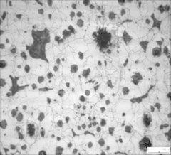 在断口2号试件横向截取试样,试样经镶嵌、磨制、抛光,在未经侵蚀的情况下观察试样的球化级别和石墨大小。根据GB/T9441-2009《球墨铸铁金相检验标准》石墨球化级别为3级,石墨大小为6级,见图4、图5所示。用4%硝酸酒精溶液腐蚀观察组织,在金相显微镜和扫描电镜下观察。该转向节所用的材料基体组织为铁素体球墨铸铁,珠光体数量为24B,见图6、图7所示。在试样的四周边缘区域有0.1mm左右的珠光体层,此外在四周边缘存在大量的缺陷,有表面加工痕和夹杂物等;经能谱成分鉴定,有大片状石墨裂纹、硫化物夹杂、氧化铝夹杂、氧化硅、氧化铁以及孕育剂熔解不充分而形成的大块的深而尖的裂纹表面缺陷,见图8、图9。